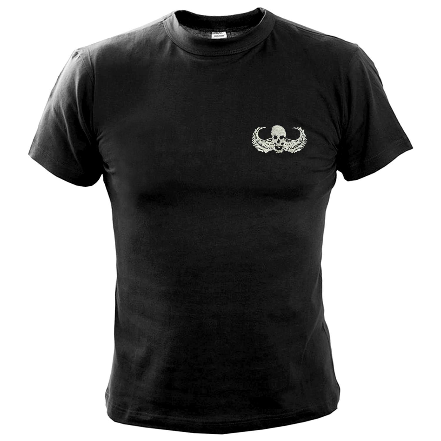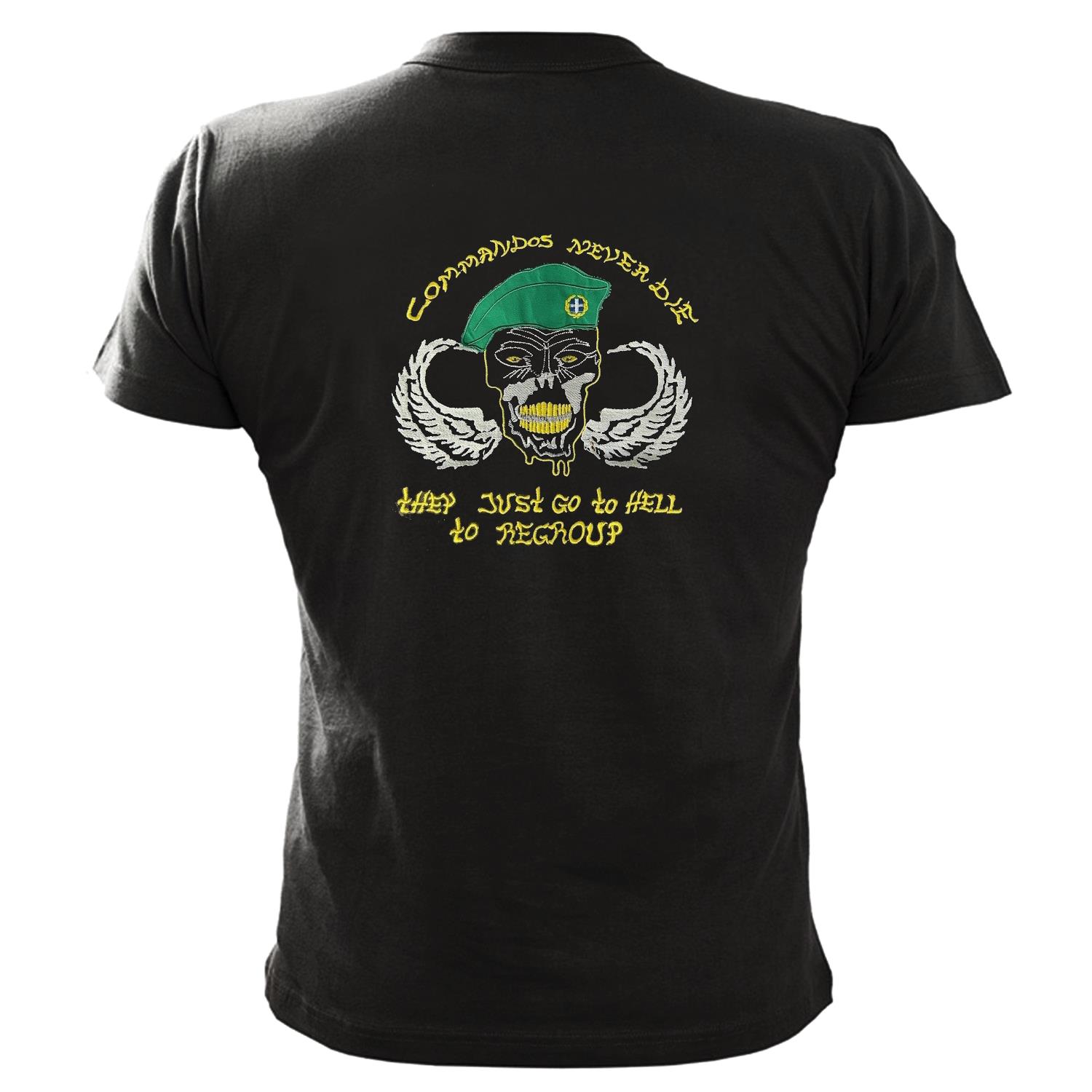 Mπλουζάκια με μεγάλες κεντητές στρατιωτικές παραστάσεις στην πλάτη με σήμα μπροστά και σημαία στο μανίκι. COMMANDOS NEVER DIE (Νεκροκεφαλή).