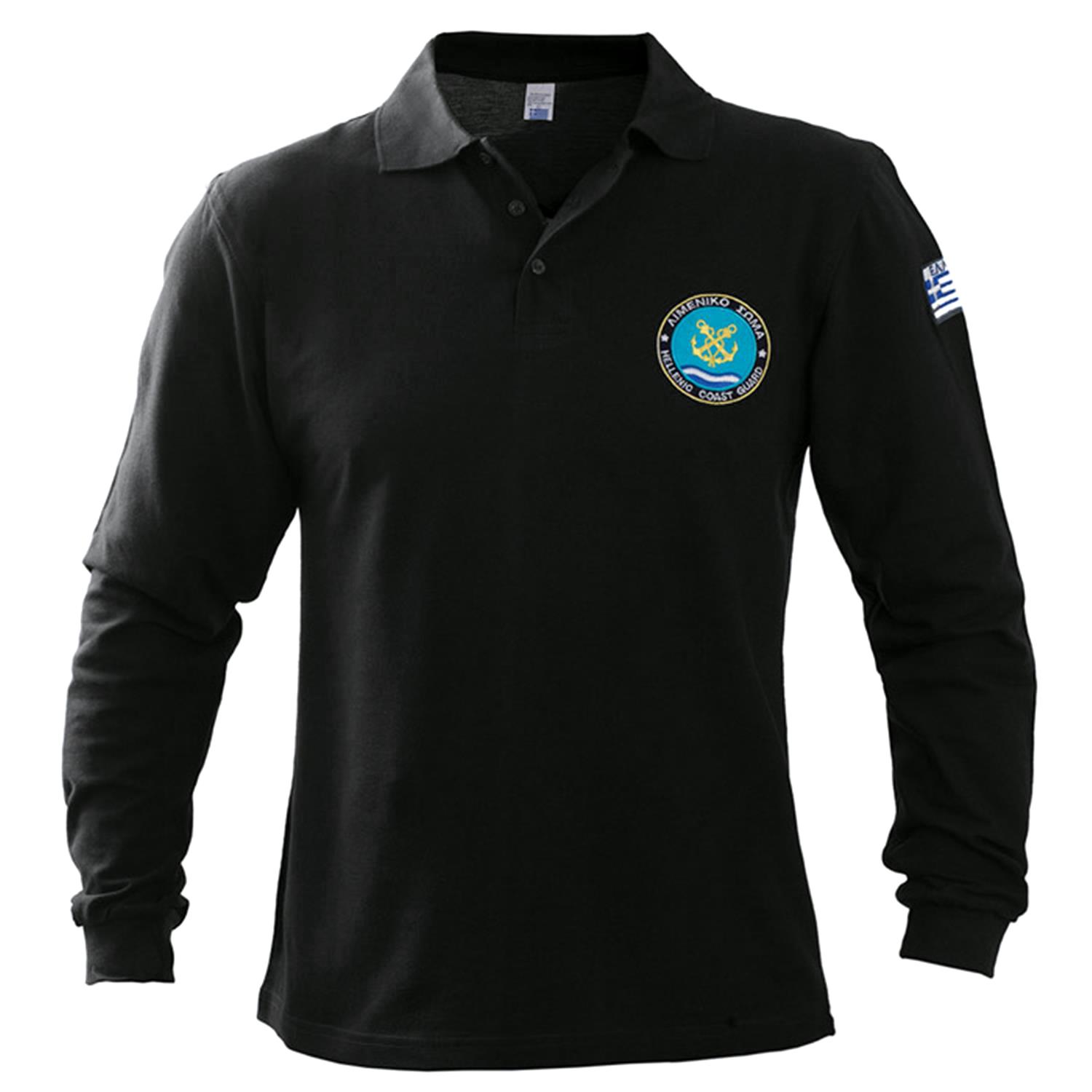 Μπλουζάκι πόλο Μαύρο με γιακά και τρία κουμπιά μακρύ μανίκι, με κέντημα Λιμενικού μπρος πίσω και σημαία στα μανίκια, (με ή χωρίς κέντημα στην πλάτη) βαμβακερό 100