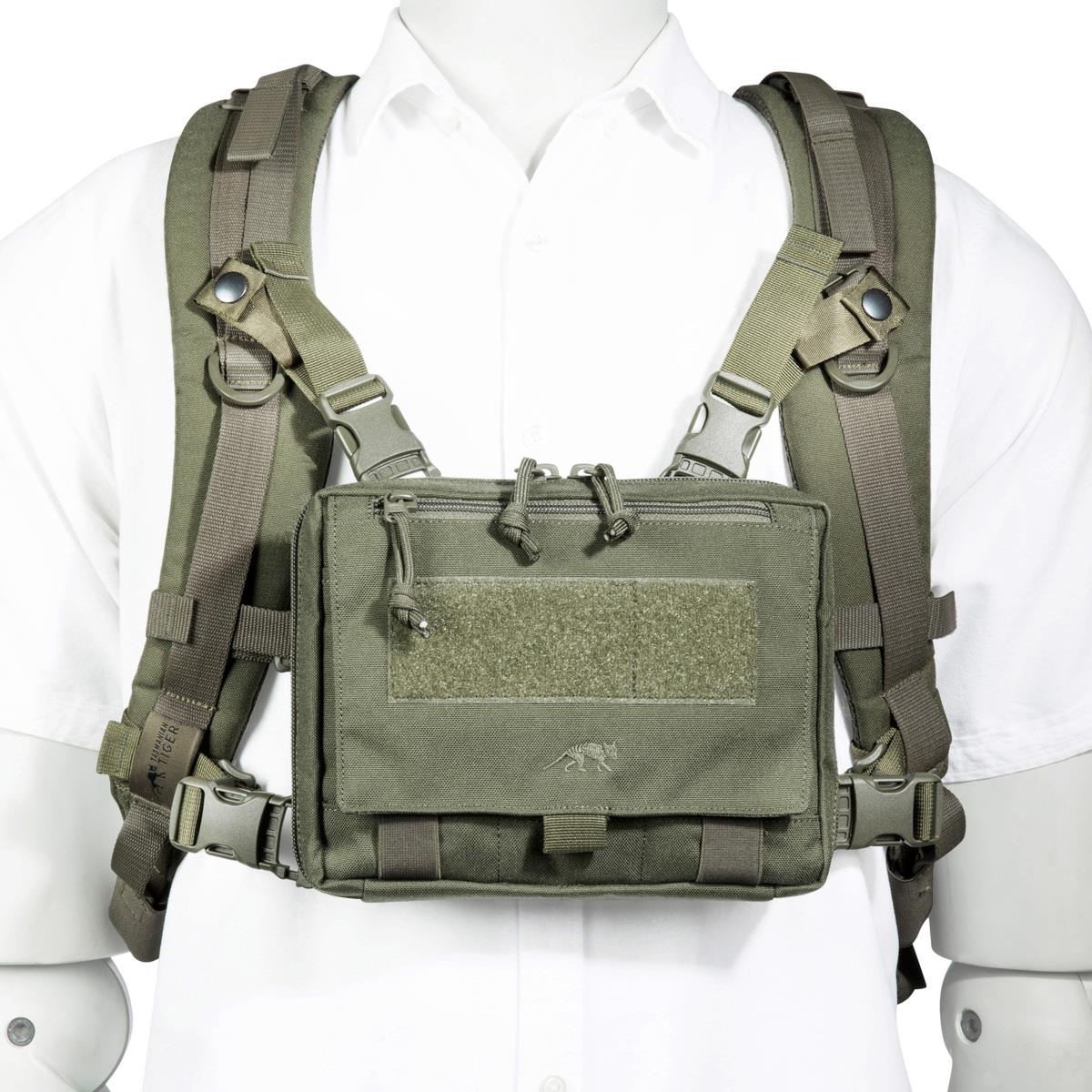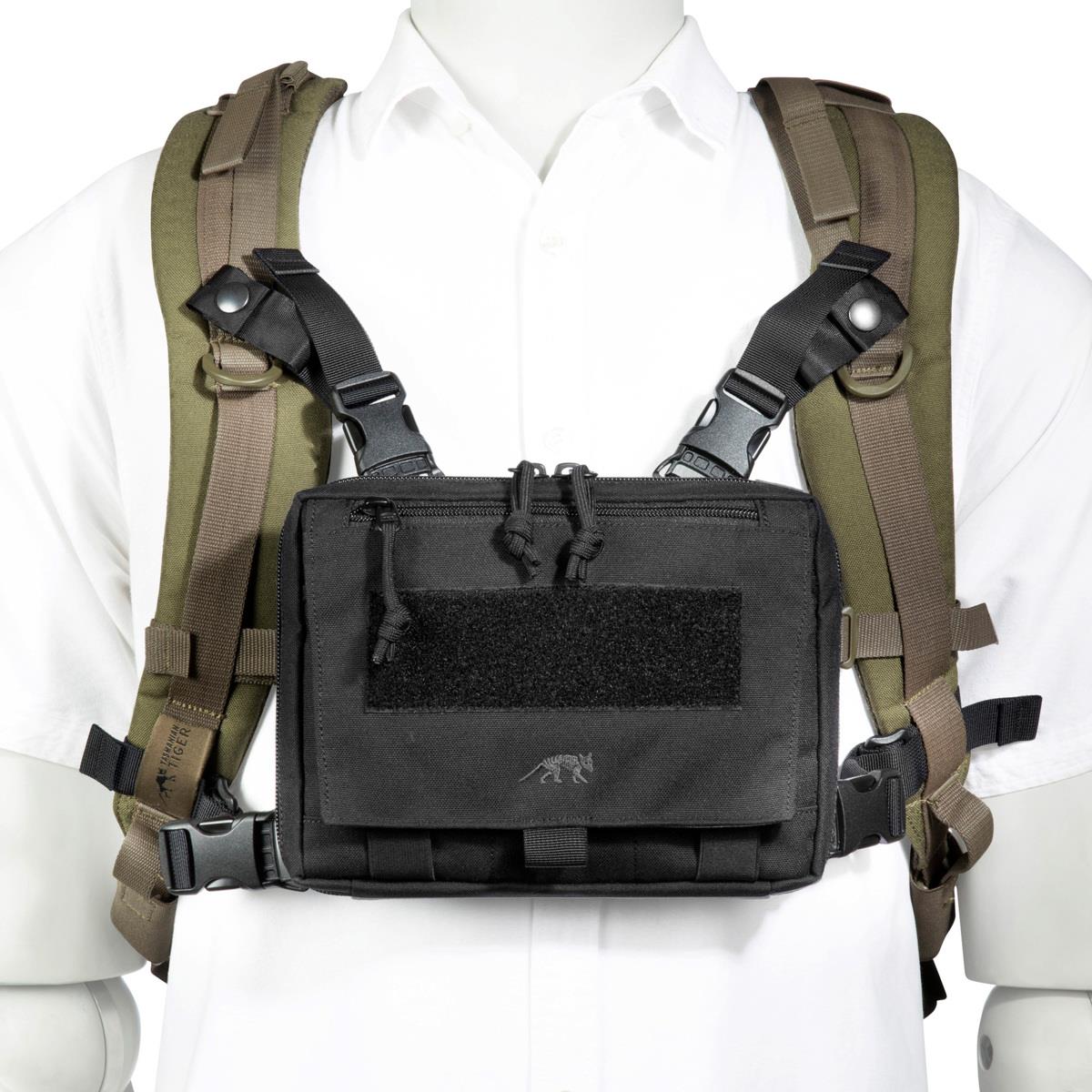 • For attaching pouches, EDC at chest level between shoulder straps