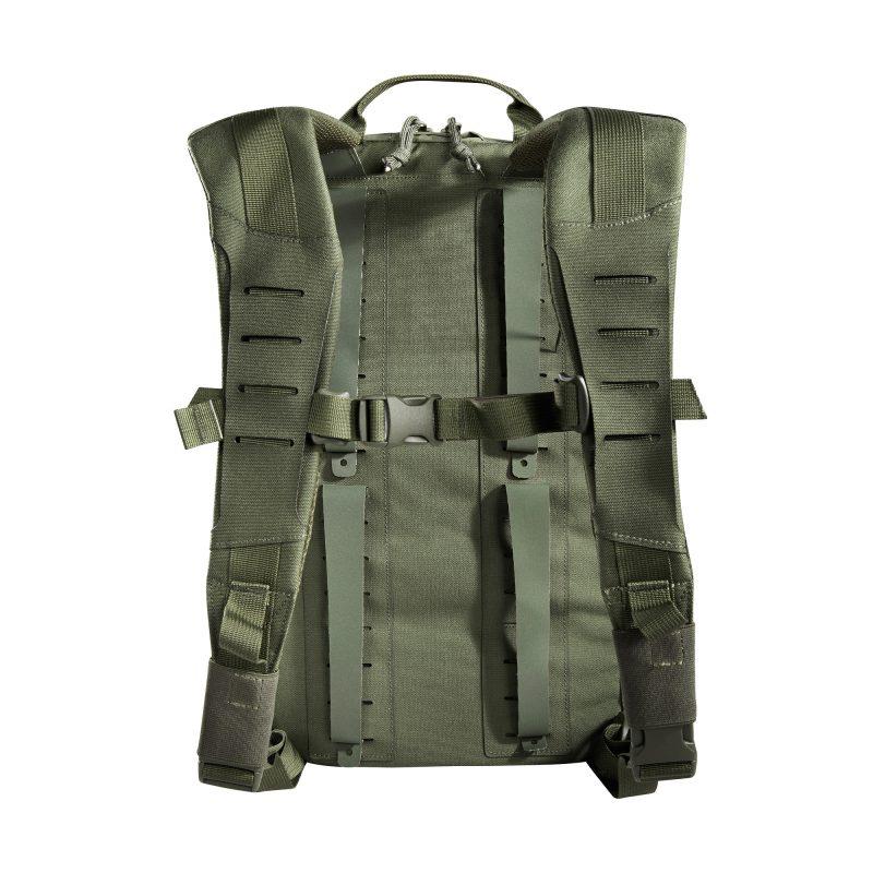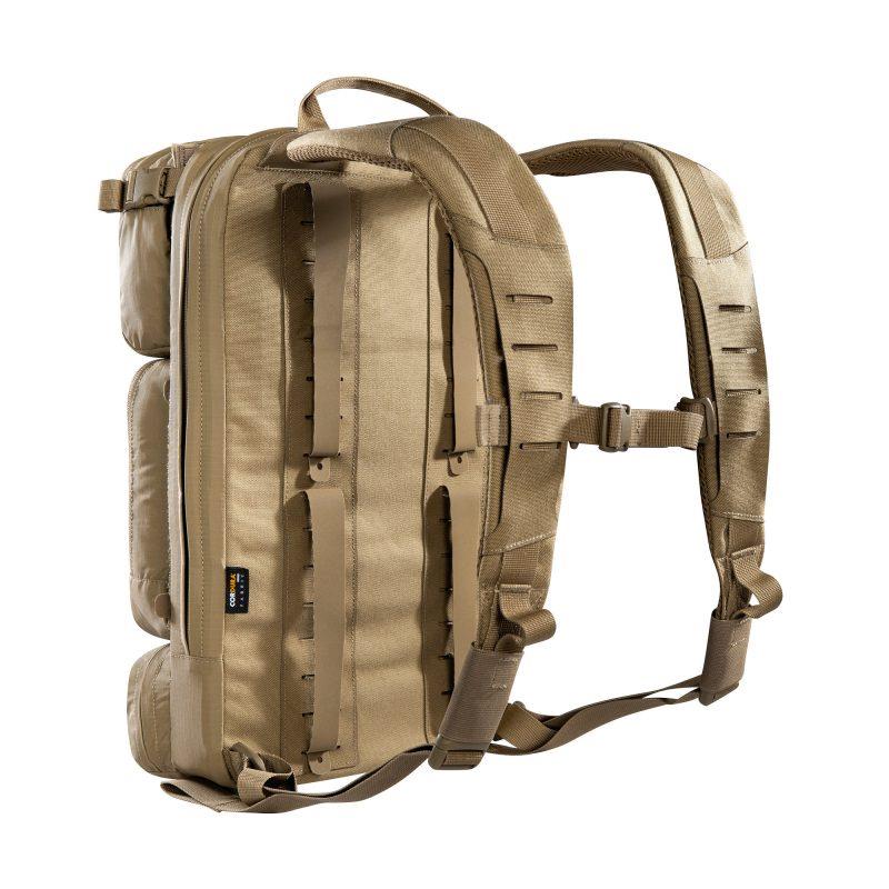 Light, tactical deployment backpack for modular use. The materials used for this deployment backpack are very light, making it super easy to handle. It has a flat main compartment that is hydration system compatible and the back panel is fitted with MOLLE hook-and-loop for customizable loading of your gear. The upper front pocket of the backpack is a flip-top behind which you can attach a magazine holder (three M4 magazines or 4 pistol / MP7 magazines, included with purchase). Both middle front pockets are removable and behind each is a MOLLE hook-and-loop surface. Both the TT Tac Pouch 12 (Item 7862) or the TT 2 SGL Backup Mag Pouch M4 (Item 7811) can be attached to the lower front pocket. The backpack has a MOLLE reverse system on the back so you can integrate it into a plate carrier. You can also use an adapter to attach it to plate carriers.