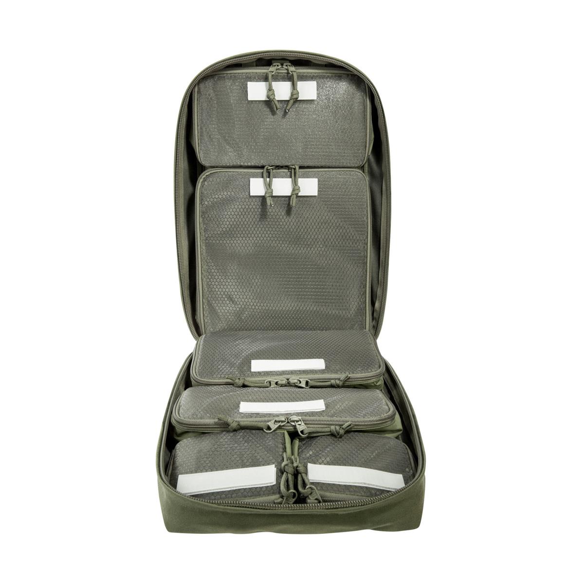 The TT Survival Pack offers the right size and equipment for the most important survival utensils. The fully expandable main compartment features six pockets of varying sizes with transparent lids, two of which can be removed. The main compartment is also covered with a large MOLLE hook-and-loop area, which allows for individual additions. The bottom compartment contains a double-sided rain cover (one side with stripes in warning orange) and a tac marker. Two shallow zippered compartments on the front are great for storing documents, for example. Additional pockets or panels can also be hooked into the existing hooks on the front. Backpack shoulder straps as well as carrying handles can be stowed when the backpack is stored in vehicles.