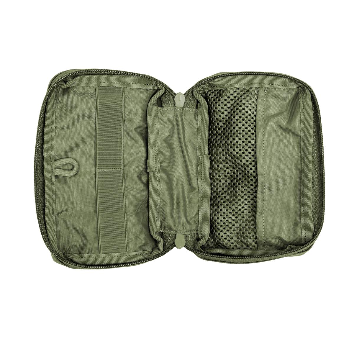 Accessory pouch with 10 x 15 x 4 cm dimensions, a large opening and the MOLLE reverse system. The inside features are a mesh pocket and elastic loops.