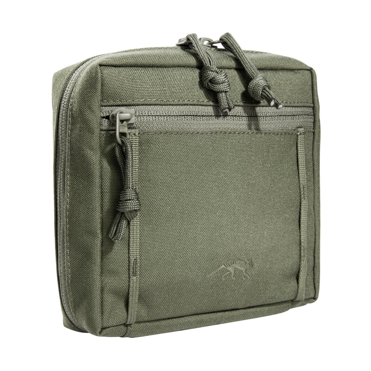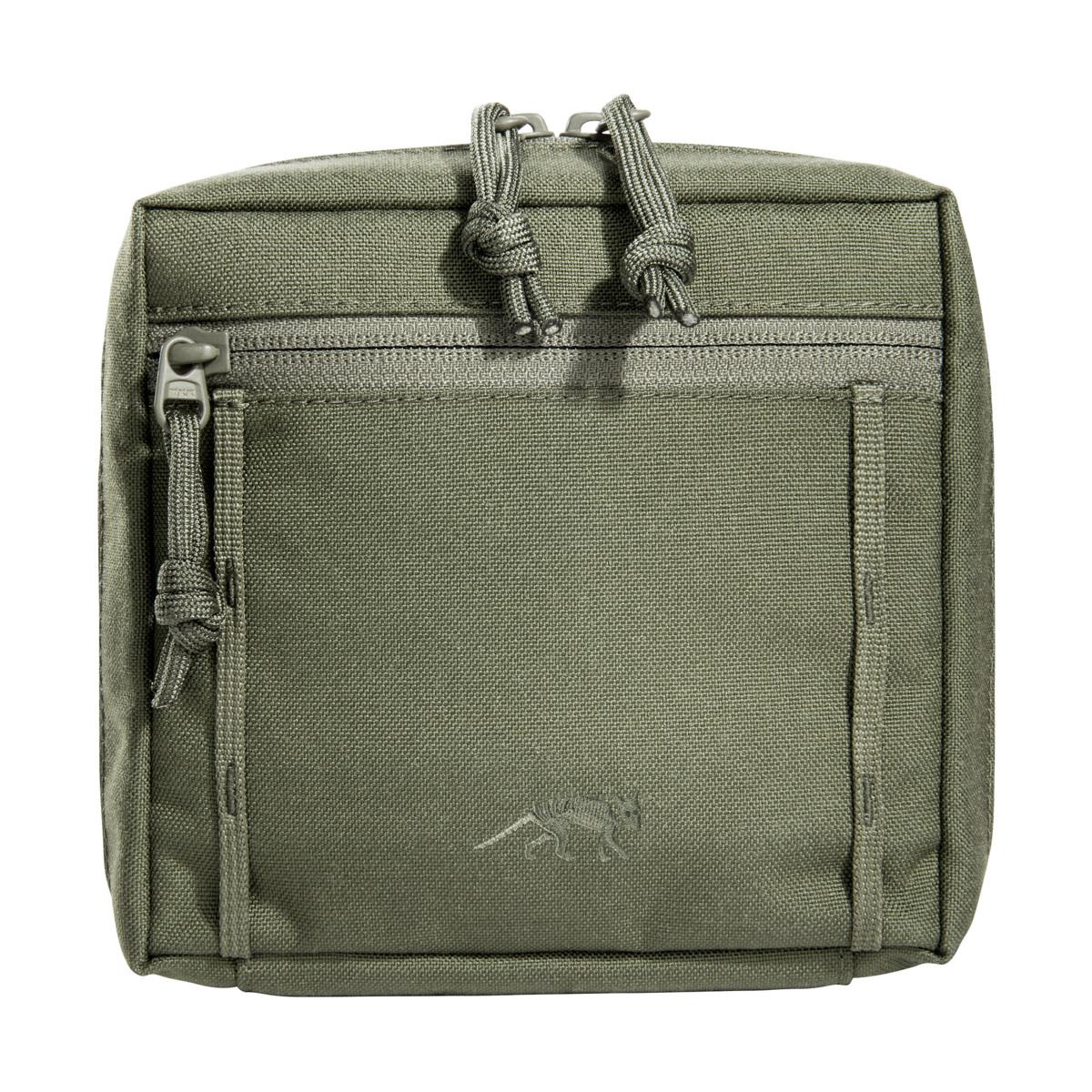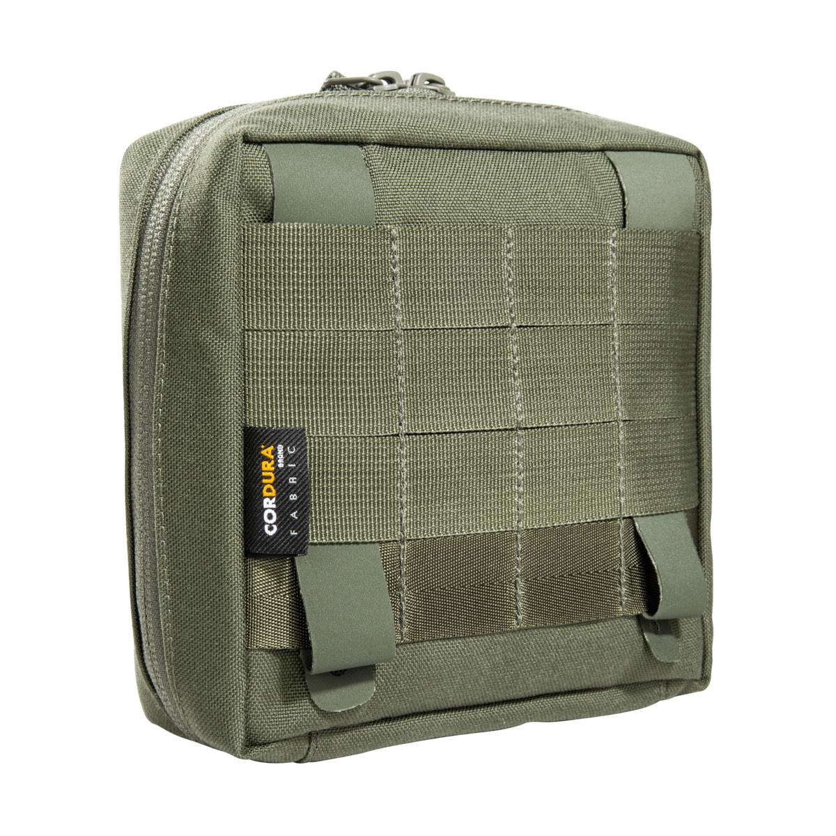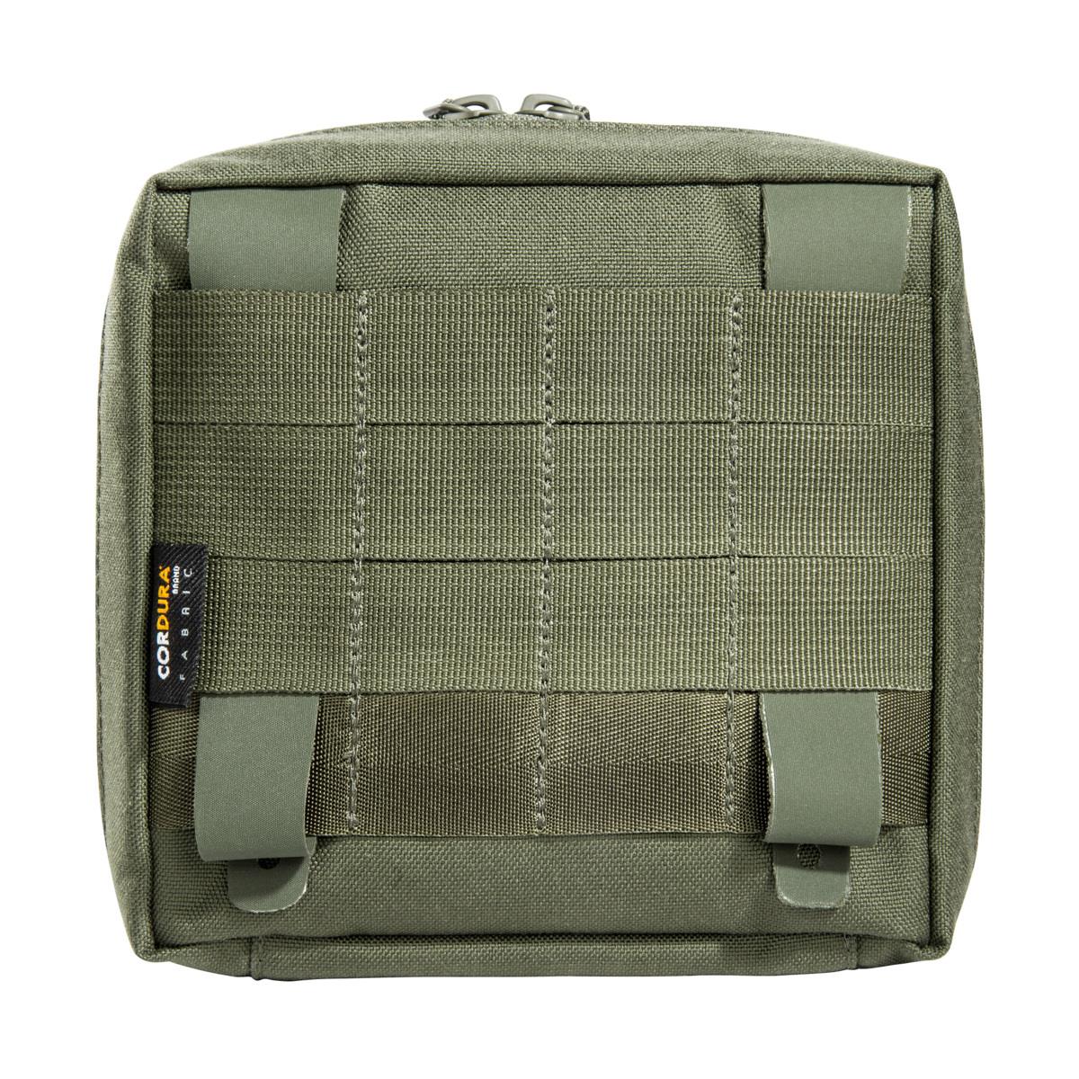 Accessory pouch with 15 x 15 x 6 cm dimensions, a large opening and the MOLLE reverse system. The inside features a hook-and-loop patch, a mesh pocket and elastic loops.