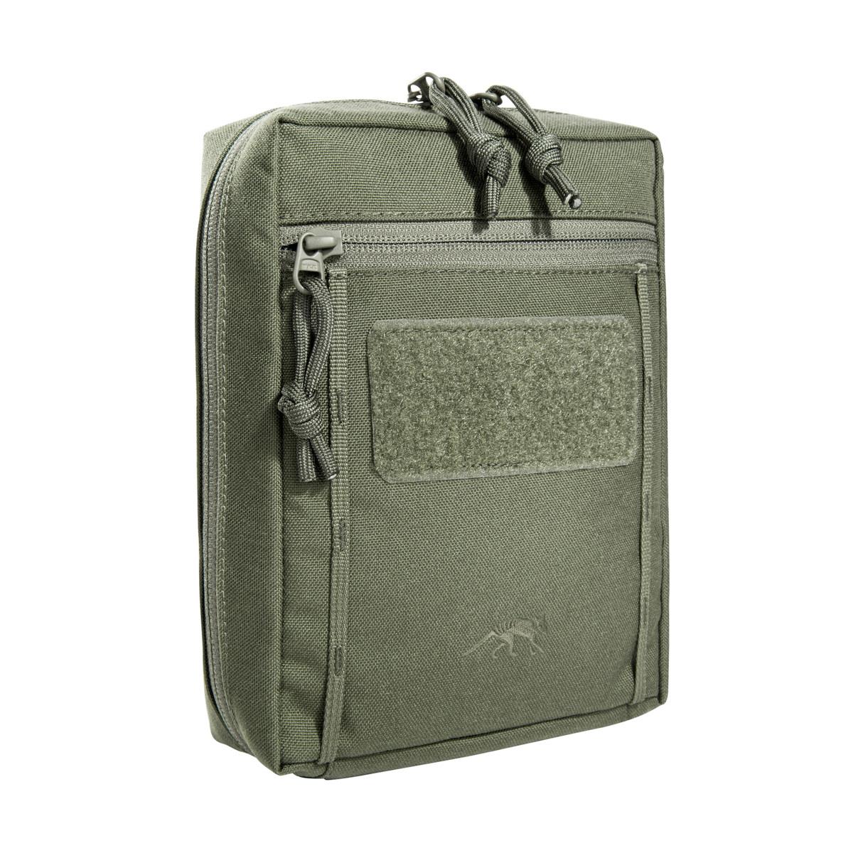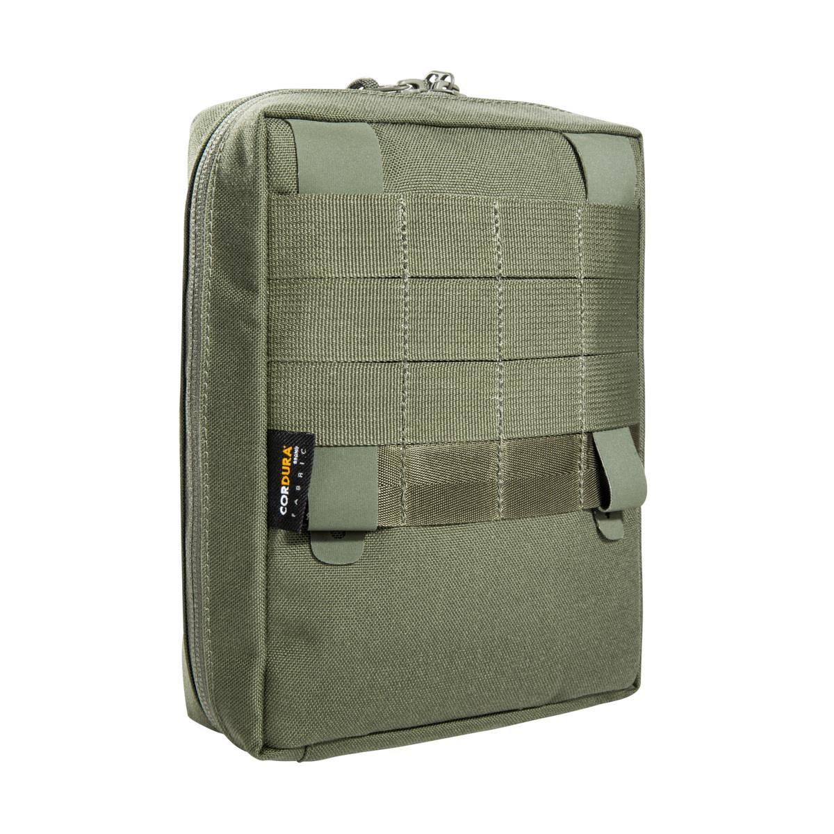 Accessory pouch with 20 x 15 x 6 cm dimensions, a large opening and the MOLLE reverse system. The inside features a hook-and-loop patch, a mesh pocket and elastic loops.