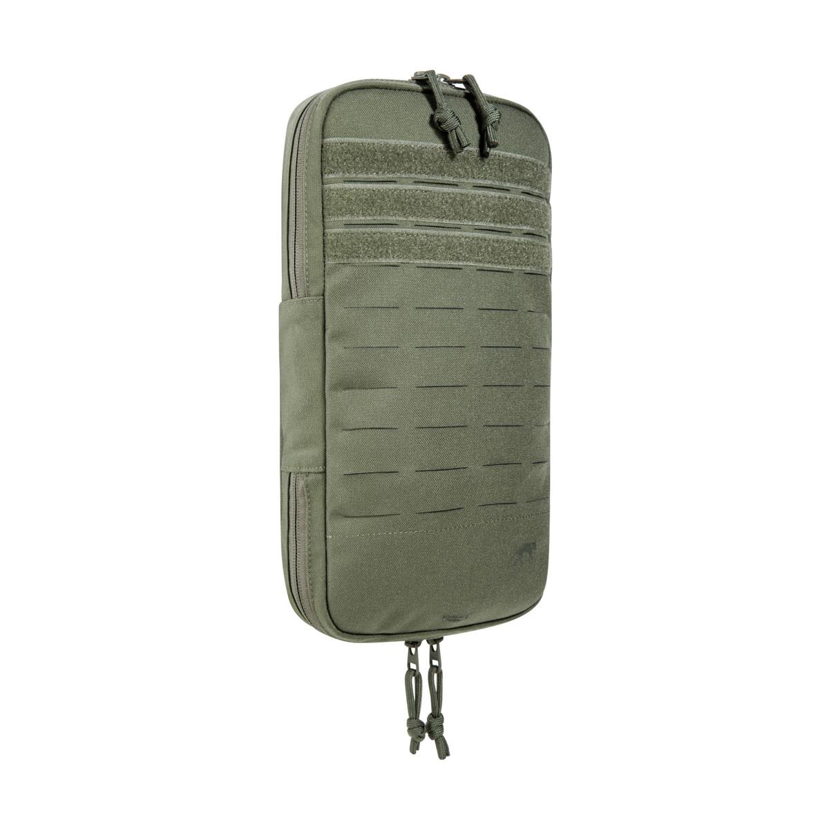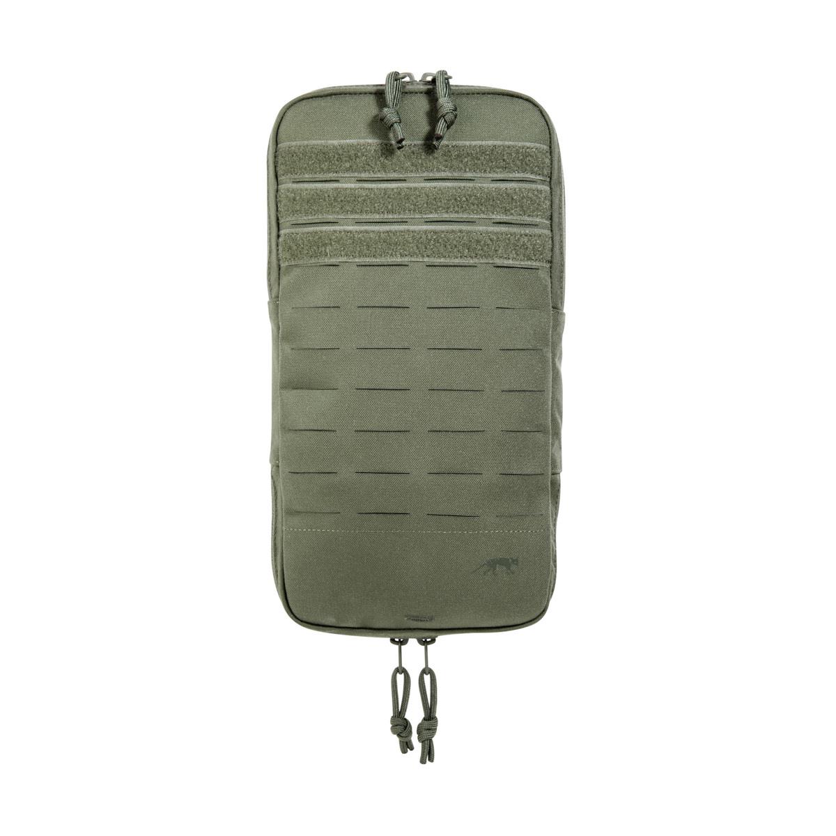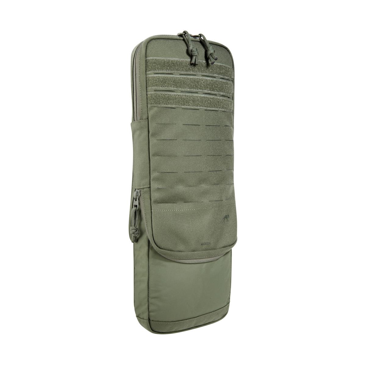 The folded pouch is designed for a 1 – 1.5 liter hydration bladder, a zipper on the bottom can increase the volume to fit a 3 liter hydration bladder or accessories. On the front is a full-length laser-cut MOLLE system for attaching other equipment. The pouch is specially designed for attachment to plate carriers.